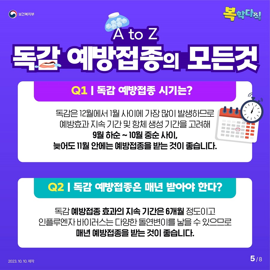 75세 이상(1949년 12월 31일 이전 출생) 노인은 10월 11일, 70~74세(1950.1.1.1.~1954.12.31. 출생), 65~69세(1955.1.1.~1959.31. 출생)는 10월 18일부터 인근 의료기관에서 독감 무료 접종을 받을 수 있습니다.